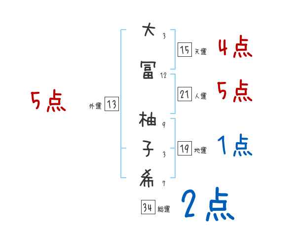 総運![]() | 大冨柚子希さんの総運は34画の2つ星!独創性に優れるが、自尊心が強く災難に注意しましょう。 あなたの人生を表す1番重要な運勢です。生涯を通じて影響する総合運となり、主に50歳以降の晩年期に影響を及ぼします。 |