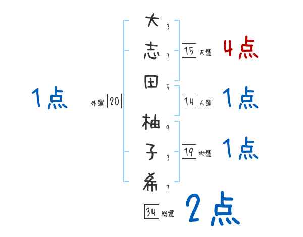 総運![]() | 大志田柚子希さんの総運は34画の2つ星!独創性に優れるが、自尊心が強く災難に注意しましょう。 あなたの人生を表す1番重要な運勢です。生涯を通じて影響する総合運となり、主に50歳以降の晩年期に影響を及ぼします。 |