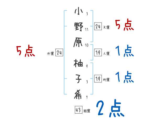 外運![]() | 小野原柚子希さんの外運は24画の5つ星!家庭運が良く順調な人生。金運にも恵まれる。 生活面を象徴する運勢です。外部から受ける影響力を表し、結婚運、家庭運や職場、環境への順応性を表します。 |