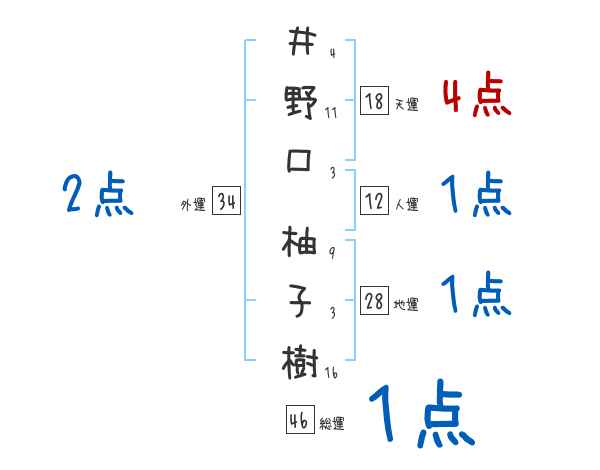 天運![]() | 井野口柚子樹さんの天運は18画の4つ星!情熱的で剛気。忍耐力があり信頼される。 家系が持つ宿命的な運勢を表します。祖先から受け継いだ苗字ですので自分の力が及びません。家柄を象徴します。 |