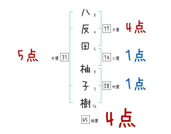 総運![]() | 八反田柚子樹さんの総運は45画の4つ星!もくもくと物事を進め達成する。地味な努力家。 あなたの人生を表す1番重要な運勢です。生涯を通じて影響する総合運となり、主に50歳以降の晩年期に影響を及ぼします。 |