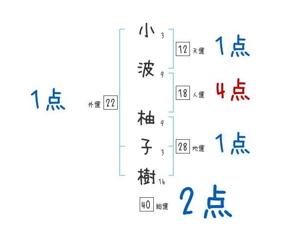 天運![]() | 小波柚子樹さんの天運は12画の1つ星!簡単な失敗で諦めてしまいやすいかも。着実に行動すると良いでしょう。 家系が持つ宿命的な運勢を表します。祖先から受け継いだ苗字ですので自分の力が及びません。家柄を象徴します。 |