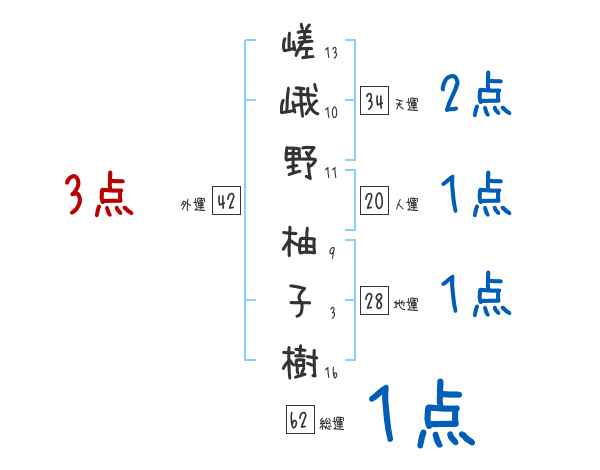 天運![]() | 嵯峨野柚子樹さんの天運は34画の2つ星!独創性に優れるが、自尊心が強く災難に注意しましょう。 家系が持つ宿命的な運勢を表します。祖先から受け継いだ苗字ですので自分の力が及びません。家柄を象徴します。 |