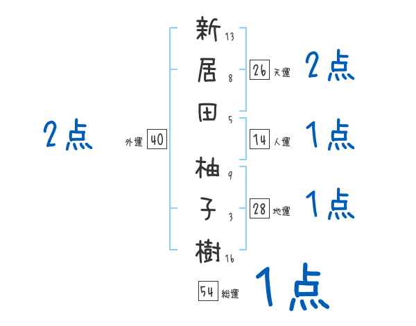 天運![]() | 新居田柚子樹さんの天運は26画の2つ星!波瀾万丈かも。信頼できる人を大事にしましょう。 家系が持つ宿命的な運勢を表します。祖先から受け継いだ苗字ですので自分の力が及びません。家柄を象徴します。 |