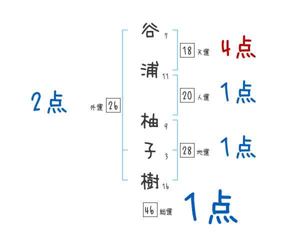 天運![]() | 谷浦柚子樹さんの天運は18画の4つ星!情熱的で剛気。忍耐力があり信頼される。 家系が持つ宿命的な運勢を表します。祖先から受け継いだ苗字ですので自分の力が及びません。家柄を象徴します。 |