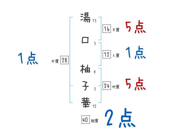 外運![]() | 湯口柚子華さんの外運は28画の1つ星!家庭環境に注意。スポーツで活躍できる能力があるかも。 生活面を象徴する運勢です。外部から受ける影響力を表し、結婚運、家庭運や職場、環境への順応性を表します。 |