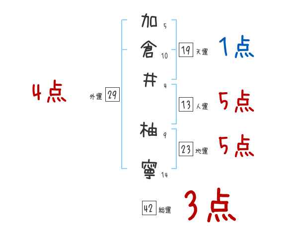 総運![]() | 加倉井柚寧さんの総運は42画の3つ星!病気に注意。多芸であるが消極的でおとなしい。 あなたの人生を表す1番重要な運勢です。生涯を通じて影響する総合運となり、主に50歳以降の晩年期に影響を及ぼします。 |