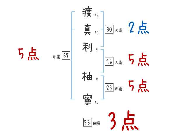 人運![]() | 渡真利柚寧さんの人運は16画の5つ星!人望が厚く大きく発展する。逆転成功が見える。 性格や才能などを表す2番目に重要な運勢です。人間関係や協調性、社会的な成功に影響します。主に20歳から50歳ぐらいまでの中年期の運勢を表します。 |