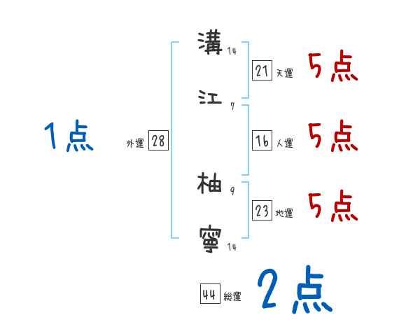 天運![]() | 溝江柚寧さんの天運は21画の5つ星!統率力がある。独立し成功する。名誉を手に入れる。 家系が持つ宿命的な運勢を表します。祖先から受け継いだ苗字ですので自分の力が及びません。家柄を象徴します。 |