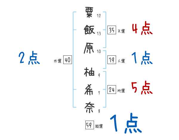 外運![]() | 粟飯原柚希奈さんの外運は40画の2つ星!自信過剰で物事に固執するためトラブルに注意。 生活面を象徴する運勢です。外部から受ける影響力を表し、結婚運、家庭運や職場、環境への順応性を表します。 |