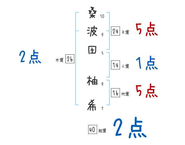 天運![]() | 桑波田柚希さんの天運は24画の5つ星!家庭運が良く順調な人生。金運にも恵まれる。 家系が持つ宿命的な運勢を表します。祖先から受け継いだ苗字ですので自分の力が及びません。家柄を象徴します。 |