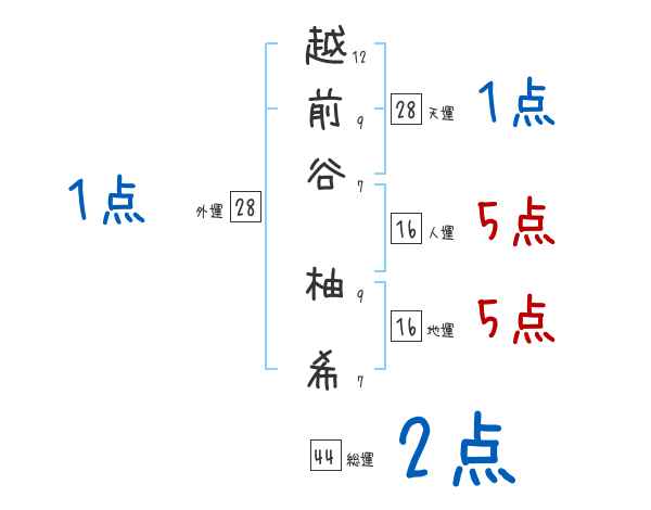 天運![]() | 越前谷柚希さんの天運は28画の1つ星!家庭環境に注意。スポーツで活躍できる能力があるかも。 家系が持つ宿命的な運勢を表します。祖先から受け継いだ苗字ですので自分の力が及びません。家柄を象徴します。 |