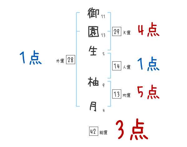 天運![]() | 御園生柚月さんの天運は29画の4つ星!完全主義で才能がある。厳格な心の持ち主。 家系が持つ宿命的な運勢を表します。祖先から受け継いだ苗字ですので自分の力が及びません。家柄を象徴します。 |