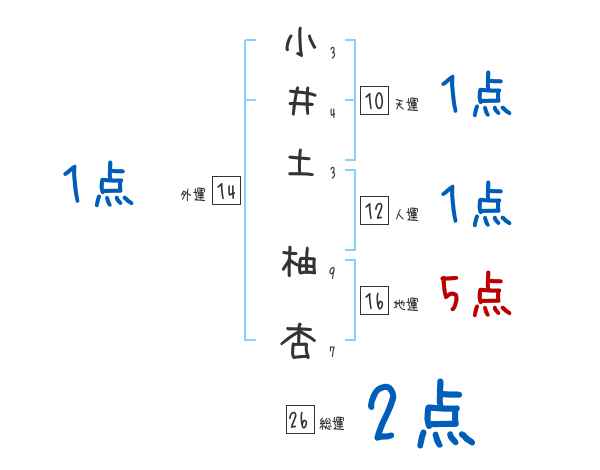 外運![]() | 小井土柚杏さんの外運は14画の1つ星!人に対して優しいがストレスを溜め込みがち。人間関係のトラブルを避けるよう気をつけましょう。 生活面を象徴する運勢です。外部から受ける影響力を表し、結婚運、家庭運や職場、環境への順応性を表します。 |