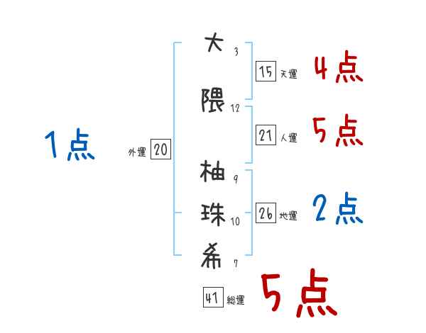 天運![]() | 大隈柚珠希さんの天運は15画の4つ星!人徳があり出世する。順調に物事を進め円満な人生。 家系が持つ宿命的な運勢を表します。祖先から受け継いだ苗字ですので自分の力が及びません。家柄を象徴します。 |