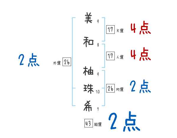 天運![]() | 美和柚珠希さんの天運は17画の4つ星!積極的な行動力。地位を気づき財産を手に入れる。純粋な心と直感力。 家系が持つ宿命的な運勢を表します。祖先から受け継いだ苗字ですので自分の力が及びません。家柄を象徴します。 |