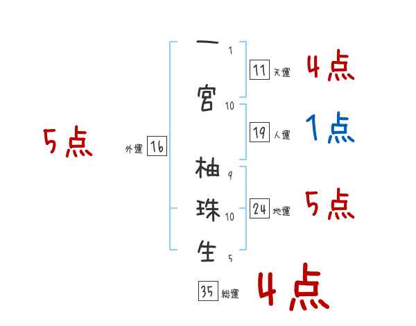 天運![]() | 一宮柚珠生さんの天運は11画の4つ星!着実に富や地位を得る幸運な人生。 家系が持つ宿命的な運勢を表します。祖先から受け継いだ苗字ですので自分の力が及びません。家柄を象徴します。 |