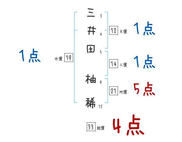 天運![]() | 三井田柚稀さんの天運は12画の1つ星!簡単な失敗で諦めてしまいやすいかも。着実に行動すると良いでしょう。 家系が持つ宿命的な運勢を表します。祖先から受け継いだ苗字ですので自分の力が及びません。家柄を象徴します。 |