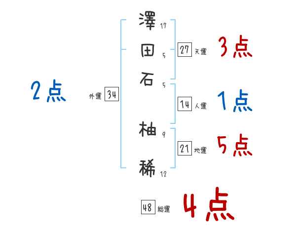 外運![]() | 澤田石柚稀さんの外運は34画の2つ星!独創性に優れるが、自尊心が強く災難に注意しましょう。 生活面を象徴する運勢です。外部から受ける影響力を表し、結婚運、家庭運や職場、環境への順応性を表します。 |