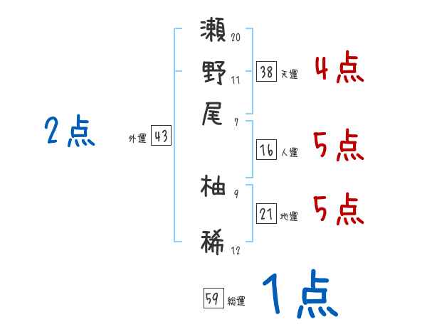 総運![]() | 瀬野尾柚稀さんの総運は59画の1つ星!意志の弱さであきらめることが多いかも。粘り強さが必要。 あなたの人生を表す1番重要な運勢です。生涯を通じて影響する総合運となり、主に50歳以降の晩年期に影響を及ぼします。 |