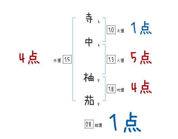 人運![]() | 寺中柚茄さんの人運は13画の5つ星!才能に恵まれ人気がある。名声を手に入れる。円満な人生。 性格や才能などを表す2番目に重要な運勢です。人間関係や協調性、社会的な成功に影響します。主に20歳から50歳ぐらいまでの中年期の運勢を表します。 |