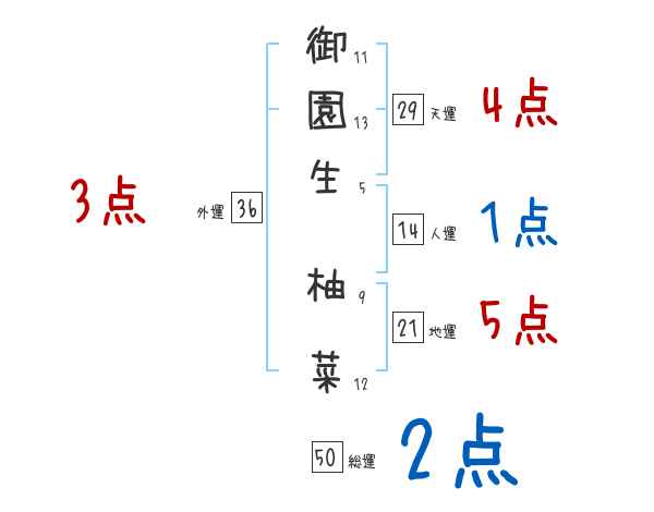 外運![]() | 御園生柚菜さんの外運は36画の3つ星!先見性が豊かです。多少神経質で苦労することも。 生活面を象徴する運勢です。外部から受ける影響力を表し、結婚運、家庭運や職場、環境への順応性を表します。 |