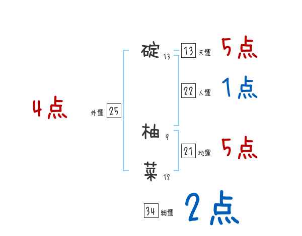 天運![]() | 碇柚菜さんの天運は13画の5つ星!才能に恵まれ人気がある。名声を手に入れる。円満な人生。 家系が持つ宿命的な運勢を表します。祖先から受け継いだ苗字ですので自分の力が及びません。家柄を象徴します。 |