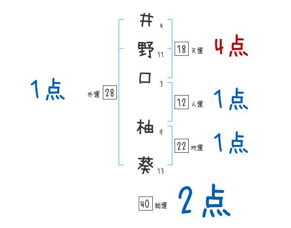 天運![]() | 井野口柚葵さんの天運は18画の4つ星!情熱的で剛気。忍耐力があり信頼される。 家系が持つ宿命的な運勢を表します。祖先から受け継いだ苗字ですので自分の力が及びません。家柄を象徴します。 |