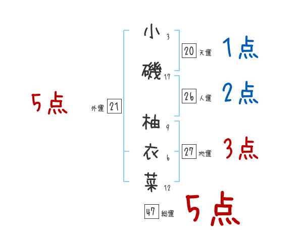 外運![]() | 小磯柚衣菜さんの外運は21画の5つ星!統率力がある。独立し成功する。名誉を手に入れる。 生活面を象徴する運勢です。外部から受ける影響力を表し、結婚運、家庭運や職場、環境への順応性を表します。 |