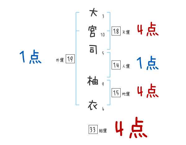 天運![]() | 大宮司柚衣さんの天運は18画の4つ星!情熱的で剛気。忍耐力があり信頼される。 家系が持つ宿命的な運勢を表します。祖先から受け継いだ苗字ですので自分の力が及びません。家柄を象徴します。 |