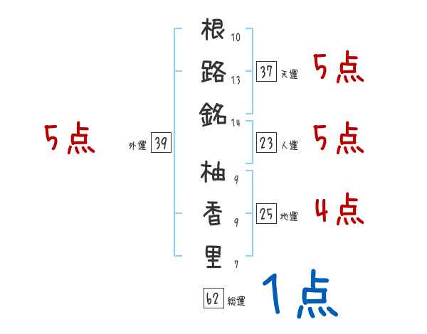 外運![]() | 根路銘柚香里さんの外運は39画の5つ星!社交性に優れ人望が厚い。人の上に立ち成功する。 生活面を象徴する運勢です。外部から受ける影響力を表し、結婚運、家庭運や職場、環境への順応性を表します。 |