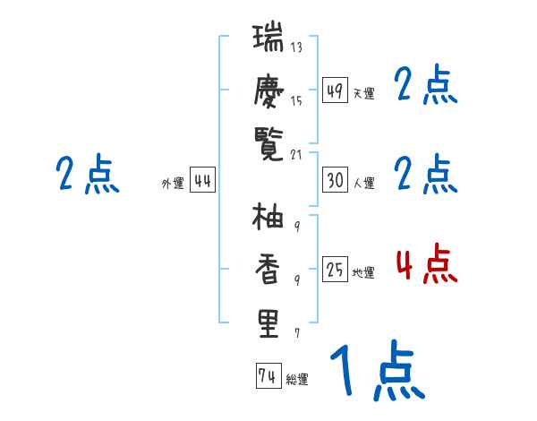 天運![]() | 瑞慶覧柚香里さんの天運は49画の2つ星!不安定な性格で明暗がある人生。周りの人には支援されやすい。 家系が持つ宿命的な運勢を表します。祖先から受け継いだ苗字ですので自分の力が及びません。家柄を象徴します。 |