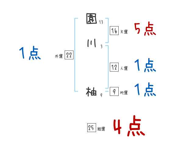 天運![]() | 園川柚さんの天運は16画の5つ星!人望が厚く大きく発展する。逆転成功が見える。 家系が持つ宿命的な運勢を表します。祖先から受け継いだ苗字ですので自分の力が及びません。家柄を象徴します。 |