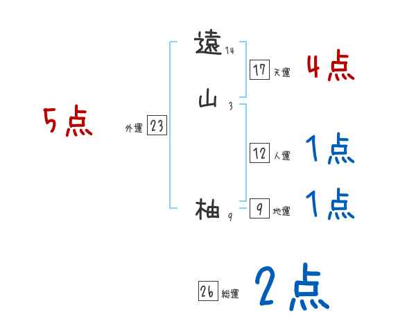 総運![]() | 遠山柚さんの総運は26画の2つ星!波瀾万丈かも。信頼できる人を大事にしましょう。 あなたの人生を表す1番重要な運勢です。生涯を通じて影響する総合運となり、主に50歳以降の晩年期に影響を及ぼします。 |