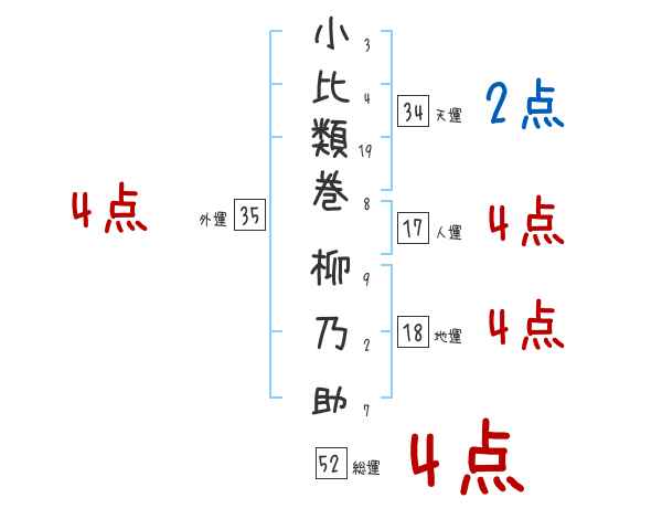 天運![]() | 小比類巻柳乃助さんの天運は34画の2つ星!独創性に優れるが、自尊心が強く災難に注意しましょう。 家系が持つ宿命的な運勢を表します。祖先から受け継いだ苗字ですので自分の力が及びません。家柄を象徴します。 |