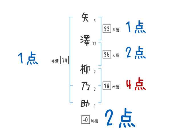 天運![]() | 矢澤柳乃助さんの天運は22画の1つ星!努力することが苦手ないっぽう手先が器用。芸術性にも優れる。 家系が持つ宿命的な運勢を表します。祖先から受け継いだ苗字ですので自分の力が及びません。家柄を象徴します。 |