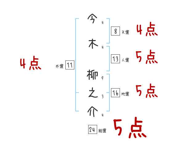 外運![]() | 今木柳之介さんの外運は11画の4つ星!着実に富や地位を得る幸運な人生。 生活面を象徴する運勢です。外部から受ける影響力を表し、結婚運、家庭運や職場、環境への順応性を表します。 |