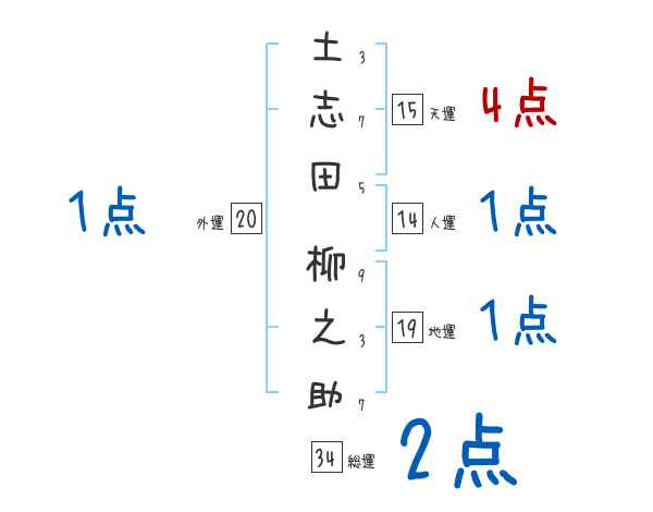 総運![]() | 土志田柳之助さんの総運は34画の2つ星!独創性に優れるが、自尊心が強く災難に注意しましょう。 あなたの人生を表す1番重要な運勢です。生涯を通じて影響する総合運となり、主に50歳以降の晩年期に影響を及ぼします。 |