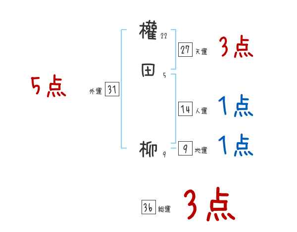 総運![]() | 權田柳さんの総運は36画の3つ星!先見性が豊かです。多少神経質で苦労することも。 あなたの人生を表す1番重要な運勢です。生涯を通じて影響する総合運となり、主に50歳以降の晩年期に影響を及ぼします。 |