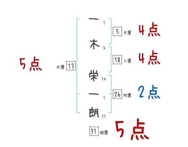 天運![]() | 一木栄一朗さんの天運は5画の4つ星!健康で安泰。協調性に優れ、財産に恵まれる。 家系が持つ宿命的な運勢を表します。祖先から受け継いだ苗字ですので自分の力が及びません。家柄を象徴します。 |