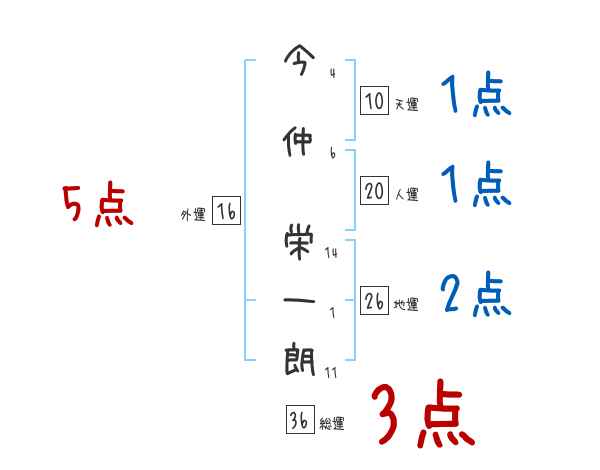 外運![]() | 今仲栄一朗さんの外運は16画の5つ星!人望が厚く大きく発展する。逆転成功が見える。 生活面を象徴する運勢です。外部から受ける影響力を表し、結婚運、家庭運や職場、環境への順応性を表します。 |