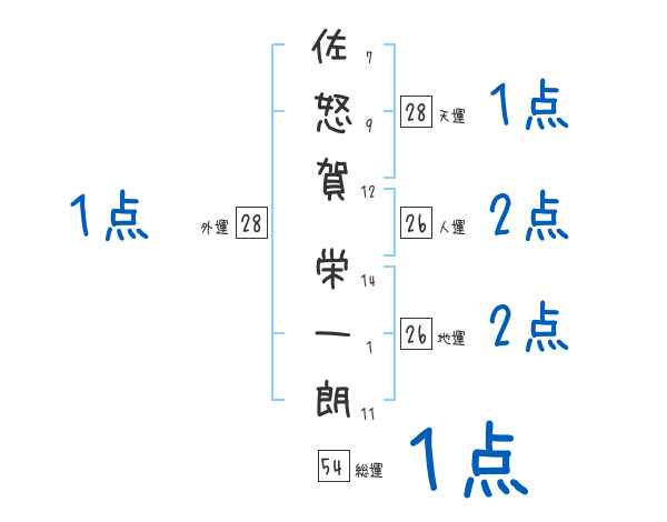 天運![]() | 佐怒賀栄一朗さんの天運は28画の1つ星!家庭環境に注意。スポーツで活躍できる能力があるかも。 家系が持つ宿命的な運勢を表します。祖先から受け継いだ苗字ですので自分の力が及びません。家柄を象徴します。 |