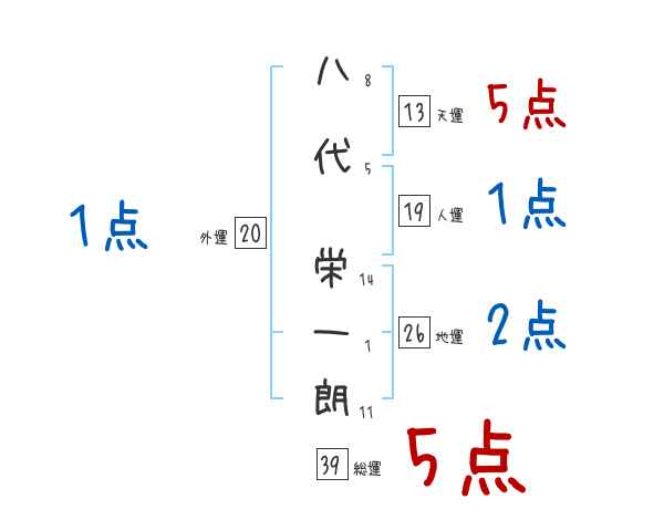 天運![]() | 八代栄一朗さんの天運は13画の5つ星!才能に恵まれ人気がある。名声を手に入れる。円満な人生。 家系が持つ宿命的な運勢を表します。祖先から受け継いだ苗字ですので自分の力が及びません。家柄を象徴します。 |