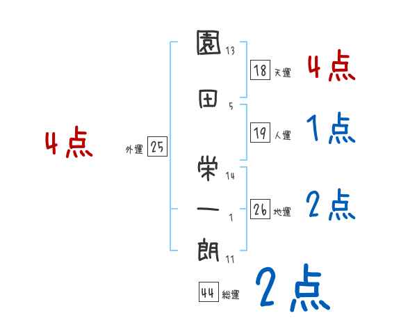 総運![]() | 園田栄一朗さんの総運は44画の2つ星!誠実で慎重な性格。物事を考えすぎないように注意しましょう。 あなたの人生を表す1番重要な運勢です。生涯を通じて影響する総合運となり、主に50歳以降の晩年期に影響を及ぼします。 |