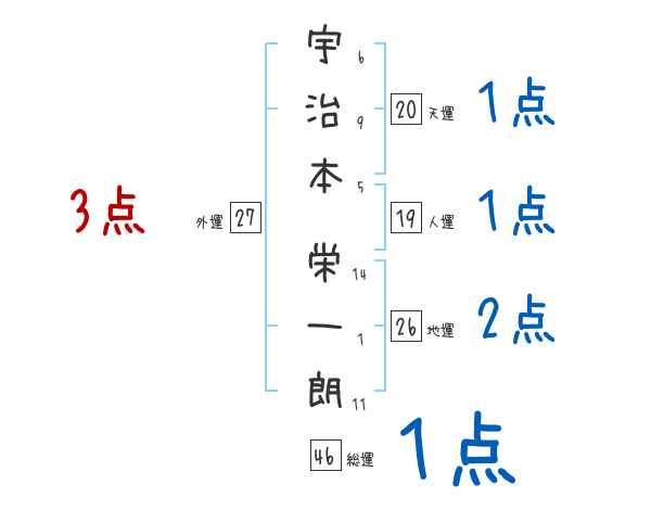 総運![]() | 宇治本栄一朗さんの総運は46画の1つ星!迷走することが多く苦労するかも。目先のことにとらわれないように。 あなたの人生を表す1番重要な運勢です。生涯を通じて影響する総合運となり、主に50歳以降の晩年期に影響を及ぼします。 |