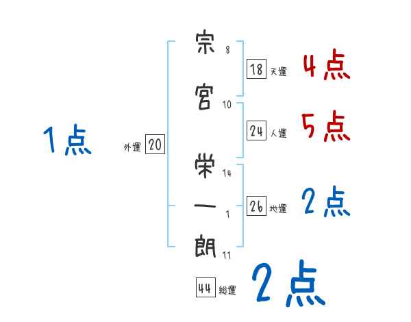 天運![]() | 宗宮栄一朗さんの天運は18画の4つ星!情熱的で剛気。忍耐力があり信頼される。 家系が持つ宿命的な運勢を表します。祖先から受け継いだ苗字ですので自分の力が及びません。家柄を象徴します。 |