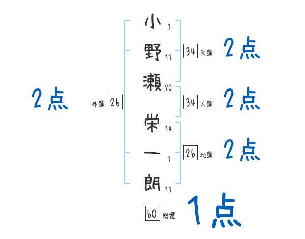 外運![]() | 小野瀬栄一朗さんの外運は26画の2つ星!波瀾万丈かも。信頼できる人を大事にしましょう。 生活面を象徴する運勢です。外部から受ける影響力を表し、結婚運、家庭運や職場、環境への順応性を表します。 |