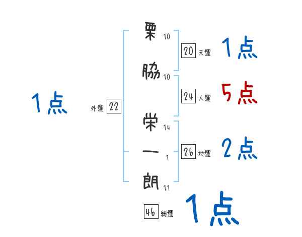 外運![]() | 栗脇栄一朗さんの外運は22画の1つ星!努力することが苦手ないっぽう手先が器用。芸術性にも優れる。 生活面を象徴する運勢です。外部から受ける影響力を表し、結婚運、家庭運や職場、環境への順応性を表します。 |