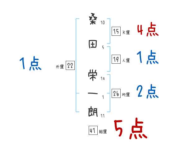 外運![]() | 桑田栄一朗さんの外運は22画の1つ星!努力することが苦手ないっぽう手先が器用。芸術性にも優れる。 生活面を象徴する運勢です。外部から受ける影響力を表し、結婚運、家庭運や職場、環境への順応性を表します。 |