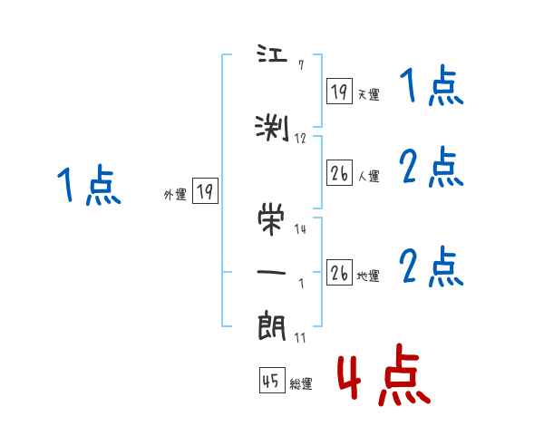 外運![]() | 江渕栄一朗さんの外運は19画の1つ星!優れた才能を持ちますが、協調性が足りないことも。周りの人と協力する事を意識しましょう。 生活面を象徴する運勢です。外部から受ける影響力を表し、結婚運、家庭運や職場、環境への順応性を表します。 |